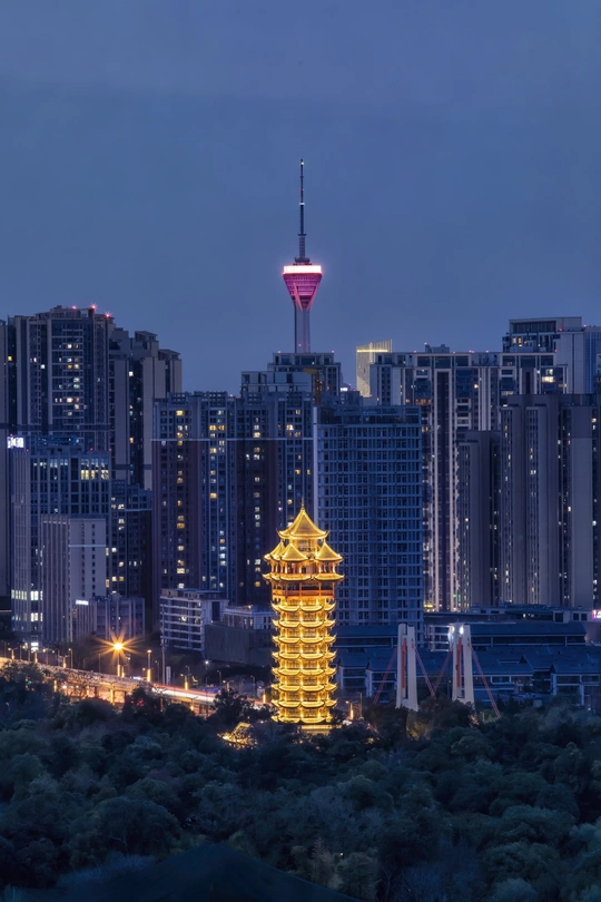 九天楼位于四川省成都市锦江区迎晖路222号塔子山园内浅丘顶部,原名散花楼,始建于隋末,为蜀王杨秀所建,但不知何时已经湮没。1995年,九天楼重修工程破土开工,1997年落成,其名取自诗仙李白名诗《登锦城散花楼》中"今来一登望,如上九天游"。九天楼高达70米,共13层,总建筑面积4千余平方米,设计精巧,结构独特,融楼塔亭台为一体,将古代建筑艺术和现代民间建筑艺术巧妙结合,享有"塔山揽秀"的美誉。 成都339是由四川省川塔恒远实业有限公司开发,依托四川广播电视塔而建的一个复合性商业综合体,因电视塔高339米而得名。成都339项目位于成都市双林路与猛追湾街交汇处,总占地65亩,其中川塔主体占地10亩,建筑面积约20000平方米,339项目占地55亩,建筑面积约24万平方米。成都339是一个集广播电视传输发射、旅游观光、餐饮娱乐、影视演艺等于一体的综合性项目。 这张照片展现了一个城市夜晚的迷人景色。高耸的塔楼和顶部的红色球体非常吸引人,仿佛是这座城市的标志。现代建筑的灯光与深色调形成了鲜明的对比,让人眼前一亮。夜晚的蓝色调也增添了一份宁静和神秘感。整个画面充满了现代都市的魅力,让人心旷神怡。
