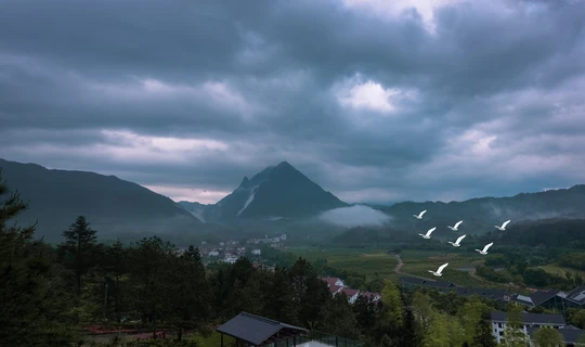 立夏,却是个多雨的天,大觉山下,绿色苁蓉,云雾飞鸟,好一幅景色。
