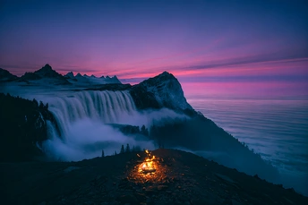 在天边渐染的霞光中,山峦如古老的守护者静默伫立。瀑布如同时间的流逝,从峭壁上跌落,发出深沉的回声。雾气缭绕,仿佛是大地深处的秘密,轻轻覆盖了这片神秘的土地。在这幽静的山谷中,篝火燃烧着,其光芒与四周的暮色形成鲜明对比。它不仅温暖了寒冷的空气,也照亮了旅者的心灵。在这无尽的宇宙之中,人类的存在显得如此渺小,但又充满了不屈的力量和探索的欲望。