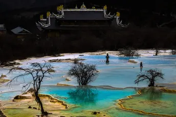 《菩萨蛮》 黄龙中寺雪纷飞, 钙化池边人独立。 彩池如调色, 山林似卫士。 松鼠绕树干, 鸟儿跳跃间。 雾气笼罩中, 仙境遗世存。
