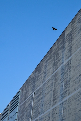 在湖南理工大学某建筑旁拍摄,墙体从拍摄视角呈引导线并且把画面分割成蔚蓝的天空和灰色的钢筋混凝土墙两个部分,展翅飞翔的鸟也象征着自由的寓意。 我觉得这是一个非常有意思的对比。