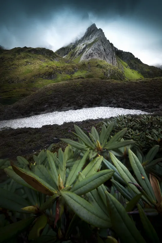 南极洛海拔四千多米,七月份仍有积雪,夹在前景植物和背景山体中间的这片积雪显得特别亮,特别吸引眼球