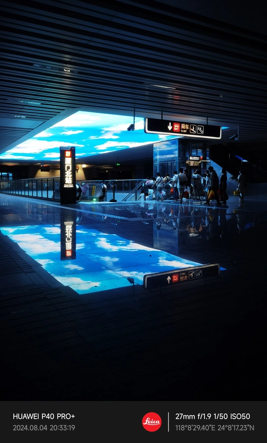 现代建筑内,巨屏显蓝天白云,水池映天,人群穿梭,神秘未来感满溢。