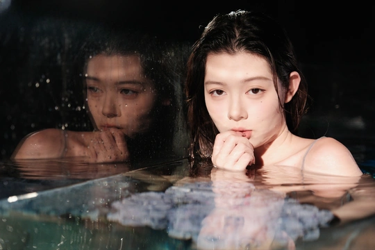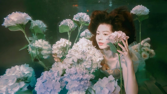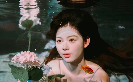 她在水中轻盈地舞动,仿佛水波化作她的裙摆,晶莹剔透的肌肤在月光下散发着柔和的光芒,宛如人间不染纤尘的仙女,融入了水的灵动与宁静。 摄影:广州湾GAGA 模特:双儿