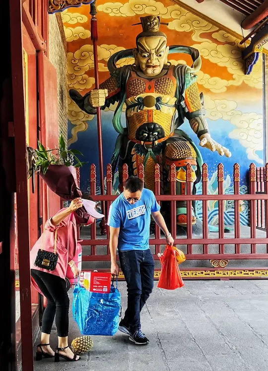 照片的构图运用了前景与背景的巧妙衔接,前面的两位人物与背后的雕塑形成了鲜明的对比,使得画面富有层次感。色彩方面,背景的鲜艳色彩与人物的朴素装扮相呼应,增加了视觉的冲击力。然而,人物的姿态和表情较为普通,缺少更深层次的情感表达,这在一定程度上限制了观者情感共鸣的能力。在光影的处理上,整体光线明亮,但可能缺乏一些阴影的变化,导致画面显得有些平面化,未能充分展现空间的立体感。后期处理上,照片的清晰度较高,但对比度和饱和度可以适度增强,以提升整体的视觉冲击力。值得改进的方向包括:一是增强人物的情感表现,吸引观众与作品产生更深的情感共鸣;二是可考虑在拍摄时利用更丰富的光影变化,增加层次感;三是在后期处理中加入一些艺术化的效果,提升整体的视觉吸引力。整幅作品在主题表达上具备一定的原创度,能引发观者对传统文化和现代生活交织的思考,整体而言是一幅具有潜力的作品,但仍需细节打磨。
