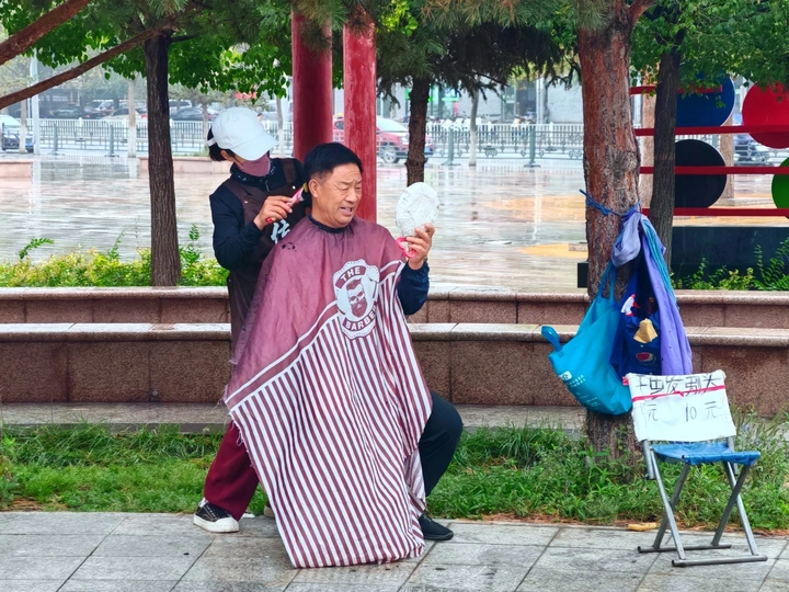 呼和浩特市宝尔汗佛塔广场内的路边露天便民理发摊