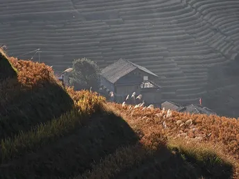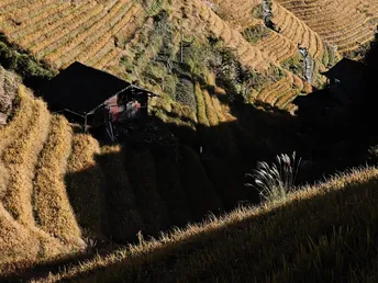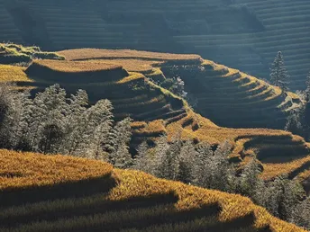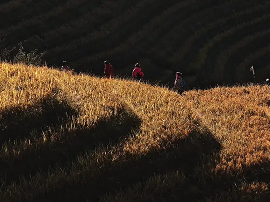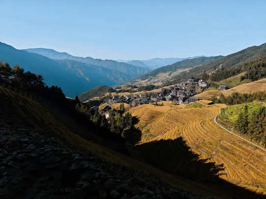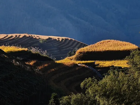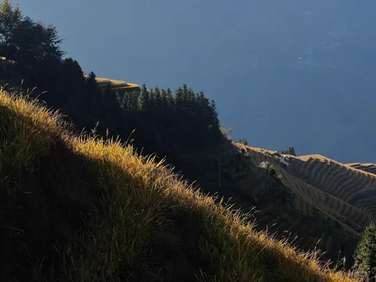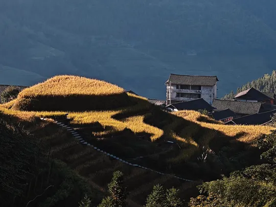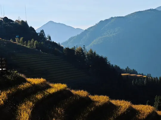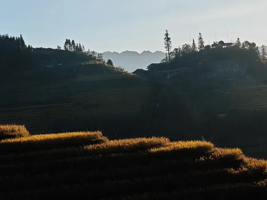 在这个天气晴好的日子里,我们踏上了龙胜龙脊梯田之旅。 当我们走近,那一片片黄灿灿的稻田瞬间映入眼帘,仿佛是大自然打翻了金色的颜料盘。成熟的稻田在阳光下闪耀着光芒,每一株稻穗都饱满而诱人。 光影在梯田上交织,勾勒出如梦如幻的画卷。阳光洒下,金色的稻田或明或暗,层次感十足。我们漫步其中,感受着微风拂过脸颊,稻香扑鼻而来,仿佛置身于一个金色的童话世界。 龙脊梯田的秋天,是一场视觉与嗅觉的双重盛宴,让人流连忘返。快来这里,与我们一同领略这黄灿灿稻田的绝美风光吧!