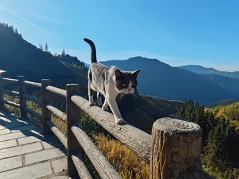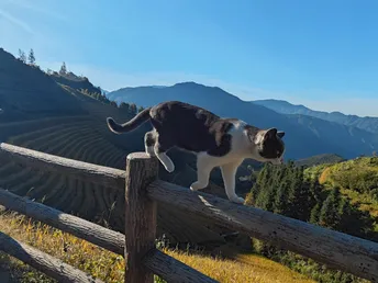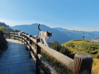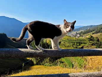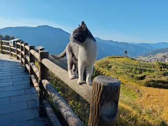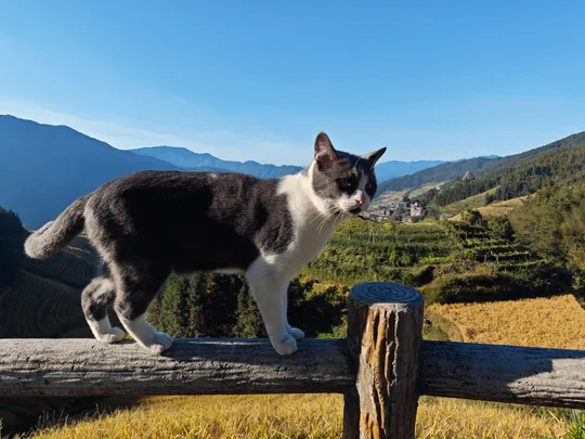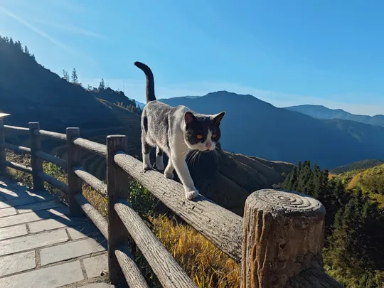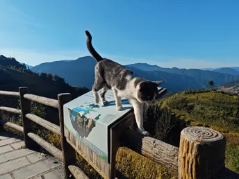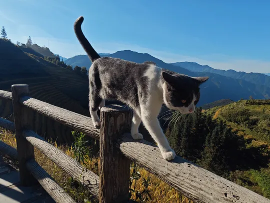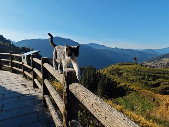 在龙胜龙脊梯田的顶峰间,有一只猫咪成为了独特的风景。光影交织下,它登顶梯田,在围栏上欢快奔跑,那灵动的身姿仿佛与大自然的画卷融为一体。它的快乐如此纯粹,感染着每一个目睹这一幕的人,让人不禁为这简单而美好的瞬间陶醉。猫咪在这片神奇的土地上,尽情享受着属于它的欢乐时光,也为龙脊梯田增添了一份别样的生机与魅力。