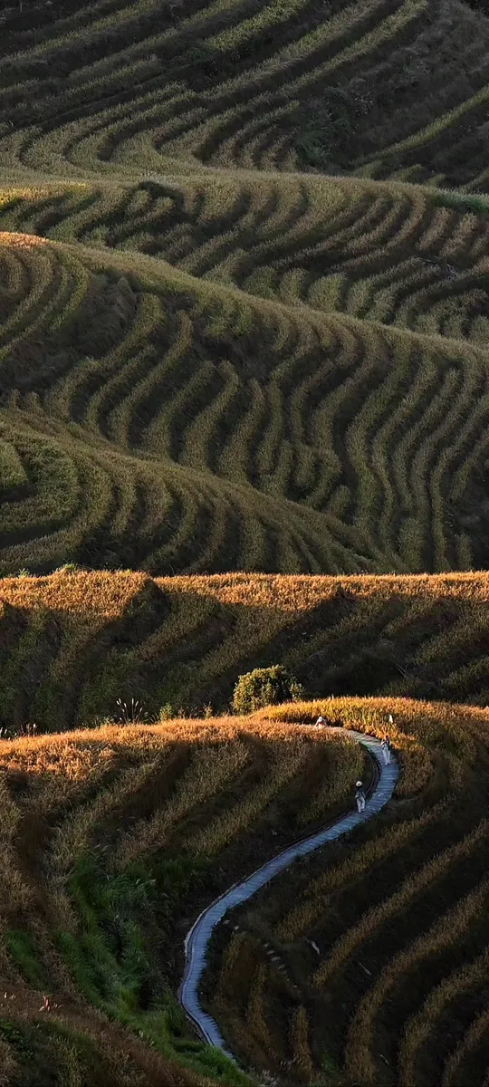 龙脊梯田,阳光倾洒,每一寸都明亮耀眼。光影在层层叠叠的田埂上舞蹈,似灵动的精灵。那弯弯的小路,如同盘踞山间的长蛇,穿梭在田中。有人在田间穿梭,身影与这壮丽的景色融为一体,构成了一幅醉人的田园画,我的手机镜头怎可错过如此美景?果断的把它拍下来。