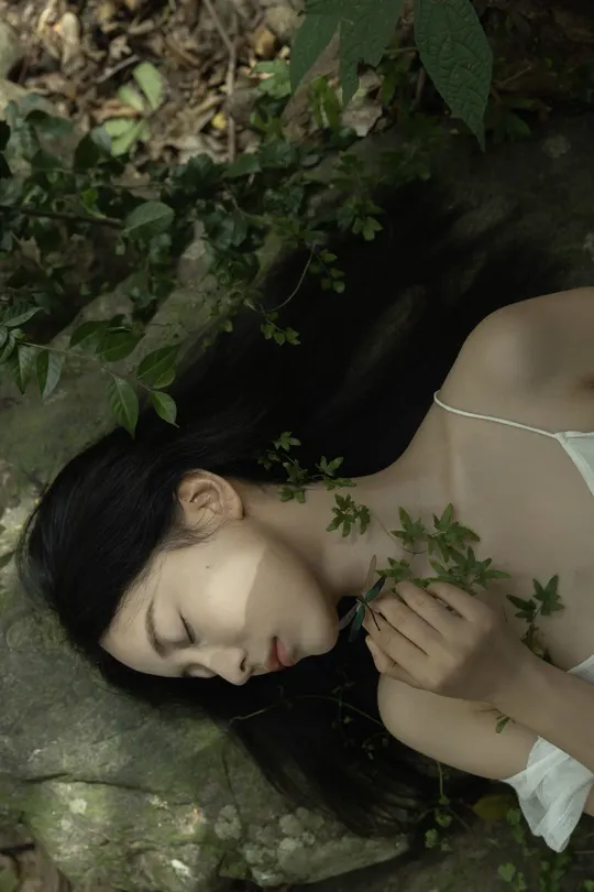 照片拍摄于深圳园山风景区,拍摄时间为上午10-11点左右,这个时候的光线一般比较硬,但透过树枝透射下来就是斑驳的光影,模特在一处石阶下缓缓躺下,投射下来的光线恰有一束打在脸上,场面极度唯美,拍摄时有调整白平衡飘逸到蓝绿色,色温5100左右,达到原图就可直出的效果。
