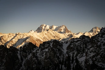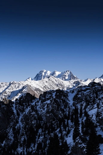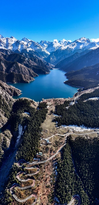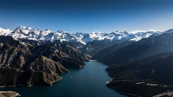 天山天池位于新疆阜康市境内的博格达峰下的半山腰,东距乌鲁木齐110公里,海拔1980米,是一个天然的高山湖泊。湖面呈半月形,长3400米,最宽处约1500米,面积4.9平方公里,最深处约105米。湖水清澈,晶莹如玉。四周群山环抱,绿草如茵,野花似锦。有“天山明珠”盛誉。挺拔、苍翠的云杉、塔松,漫山遍岭,遮天蔽日,十分美丽。
