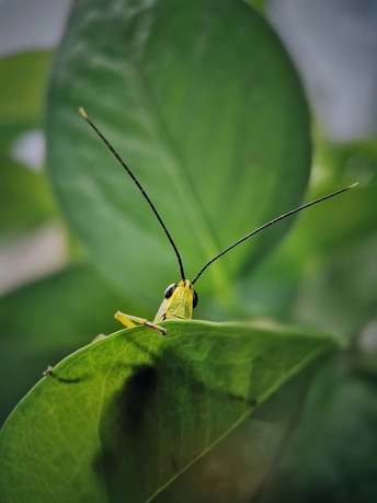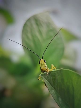 我不去见它,它自来见我,这只蝗虫飞到店里,停在绿萝上,爬在玻璃上,安静的做个称职的模特,在我的镜头里留下他的身影。