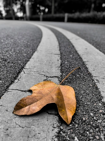 公园休闲步道上,一片凋落的枯黄的树叶,与路面标线交错在一起,昭示着季节变化更替,深秋已驾到。