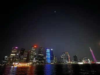 画面中可以看到珠江沿岸璀璨的高楼大厦,许多建筑都被绚丽的灯光照亮,其中还有广州塔(俗称“小蛮腰”)这样极具标志性的建筑。江面上有游船,灯光闪烁,营造出繁华而迷人的夜景氛围。珠江夜游是广州的经典旅游项目之一,游客可以在游船上欣赏到珠江两岸美轮美奂的灯光夜景。