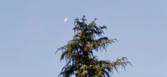 清晨时分,未隐的月亮露出半个,和雪松做了伴。