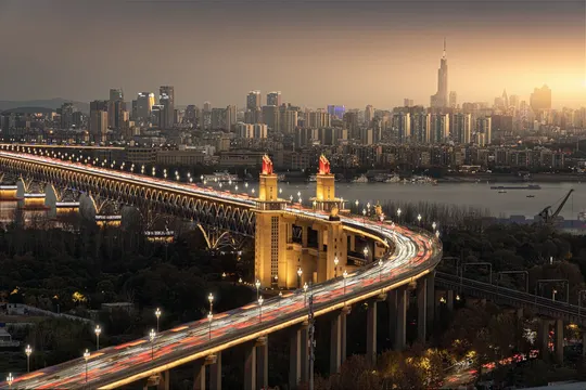 在金陵城的黄昏余晖中,南京长江大桥宛如一条巨龙横卧在长江之上,尽显雄伟壮丽。大桥上,车水马龙,车灯的轨迹如流星般划过,与桥身的灯光交相辉映,编织出一幅流动的画卷。