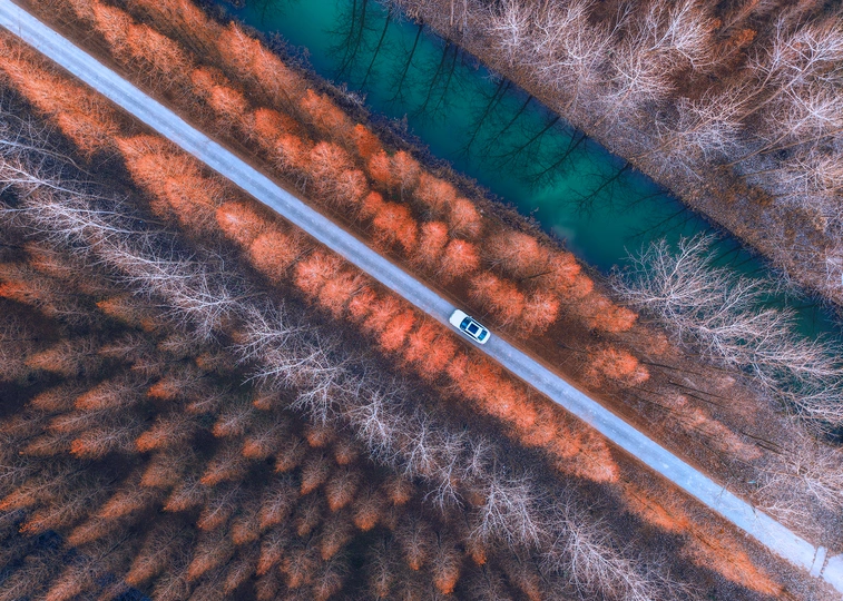 冬季的红衫树火红绚丽,从高空俯瞰犹如一幅优美的画卷在眼前展开。