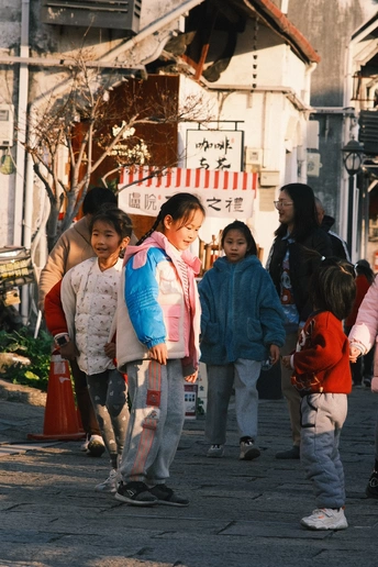 这是我在杭州西兴古镇拍到的一张照片,当时古镇的老街正在举办了一场迎春集市活动,一帮孩子在那里蹦啊跳啊,然后刚好夕阳就照在他们的身上,我瞬间举起了相机…