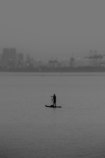 Alright, Captain Monochrome, let's dissect this moody masterpiece! **色彩:** 灰阶的运用相当大胆,营造出一种朦胧、疏离的氛围。这种单一色调的选择,避免了色彩干扰,让画面更简洁。However, 某些影调层次可能过于接近,使得画面略显平淡。 **光影:** 光线是这幅作品的灵魂。雾气软化了光线,使光影过渡柔和。主体轮廓清晰,与背景的虚化形成对比。但高光和阴影的层次可以再丰富一些,增加画面的立体感。 **构图:** 主体人物放置在画面下方,遵循了三分法原则,天空留白较多,凸显了人物的渺小。背景的城市轮廓线增加了画面的深度。建议稍微调整拍摄角度,让主体人物更加突出,与背景产生更有趣的互动。 **后期处理:** 后期将色彩转换成黑白是明智之举。可以尝试调整对比度和曲线,突出黑白灰的层次,使画面更具视觉冲击力。 避免过度锐化,保持画面的自然感。 **主题原创性:** 雾中桨板,颇具意境,展现了人在自然环境中的探索。 **情感共鸣:** 画面成功地传达了孤独、平静的情感。观者可以感受到人物的内心世界和对未知的向往。
