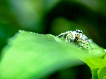 -一片绿叶,一只跳蛛,一场属于大自然的隐秘捕食戏码正在上演。
