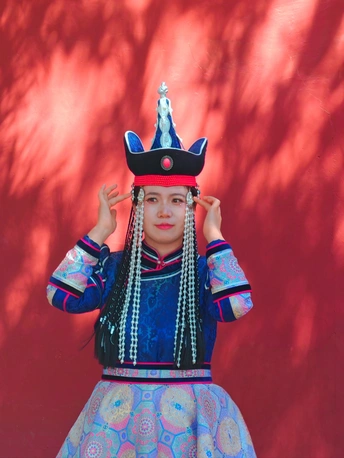 红墙下的蒙古丽人,光影里如此的美丽。