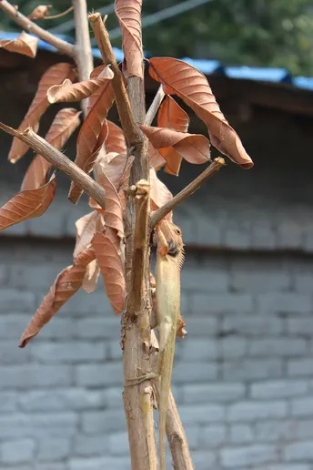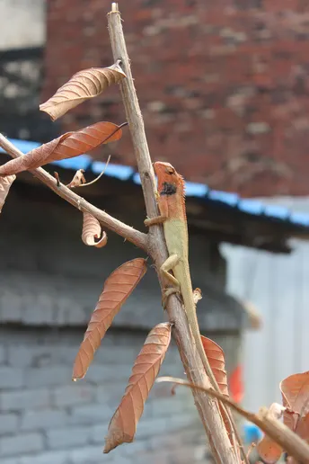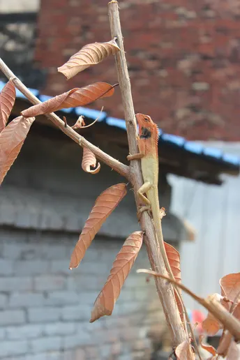 变色树蜥是鬣蜥科、树蜥属的爬行动物,由于其体色可随环境而变,故得此名。变色树蜥别名马鬃蛇、公鸡蛇、雷公蛇。体长80~90毫米,尾很长,约为体长的3倍。体近三角柱形。头四角锥形,吻钝圆,吻棱棱角明显,鼓膜裸露,比眼径略小。鼓膜上方有二棘状鳞。头部鳞大小不等,头顶上方有一白点。自头后至尾基部正脊鬣鳞,越向后鬣鳞越小,至尾基部之后消失。四肢长,后肢贴体前伸达鼓膜或眼,前后肢有5指、趾,均具爪。生活时易变色,背部有深色斑,尾部有深浅相间的环纹。 变色树蜥行动迅速,追捕时,常攀援上树。爬行时常扬起头,能从这一树枝跳至另一树枝上。遇惊能从四五米高的树上跳下地,钻入草丛中逃逸。