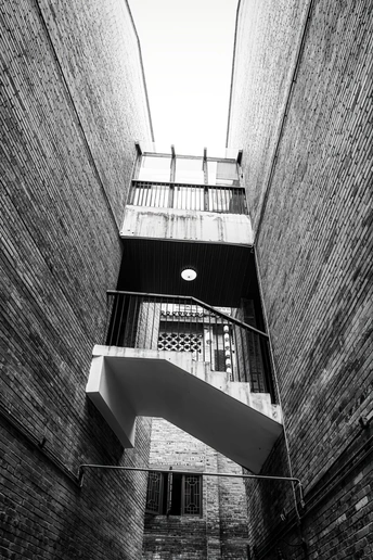 这张图片以独特的视角和强烈的视觉冲击力引人注目。从构图上看,图片采用了一种引导视线的拍摄手法,仰视的角度使得两旁的墙壁形成一种天然的通道,引导观者的视线逐渐延伸到天空,增强了画面的深度感和层次感。墙壁的线条和楼梯的曲线形成了有趣的对比,增添了画面的动态感。 色彩上,图片采用黑白色调,使得画面更加经典和富有时间感。黑白色调去除了色彩的干扰,使得光影效果和结构对比更加突出,增强了画面的戏剧性和艺术感。 情感上,这张图片给人一种既封闭又开放的感觉。狭窄的巷道和高耸的墙壁带来了一种压抑感,而顶部的天空则带来了一丝开放和自由的希望。这种对比能够引发观者的思考,关于束缚与自由、封闭与开放之间的辩证关系。 主题上,图片通过建筑元素和视角的选择,表达了一种对空间和环境的独特理解,展现了城市建筑与人类活动之间的互动。 艺术价值上,这张图片通过其独特的构图、强烈的对比和富有深意的主题,展现了摄影师对空间和结构的敏锐观察力和艺术表达能力。它不仅仅是一张建筑照片,更是一幅能够引发观者深思的艺术作品。 总体而言,这是一张兼具视觉冲击力和艺术深度的黑白摄影作品。 “幽巷”突出了巷道的幽深,配以独特的天光,相得益彰