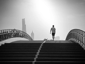 独行阶上,城市剪影映眼眸,每一步都踏向心中的那片光。