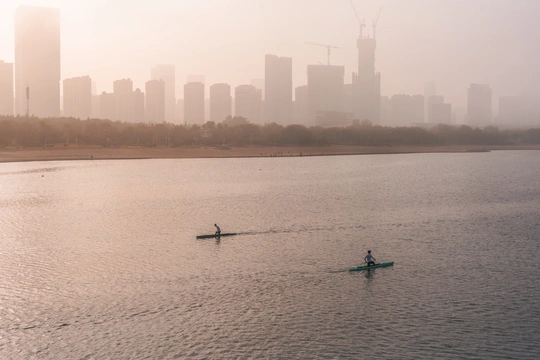 初夏的傍晚,山东日照被淡淡的雾气笼罩着,海风中夹杂着咸湿的气息,世帆赛基地前的海上,落日余晖映照着两位运动员英姿勃勃的身影,奋勇向前。