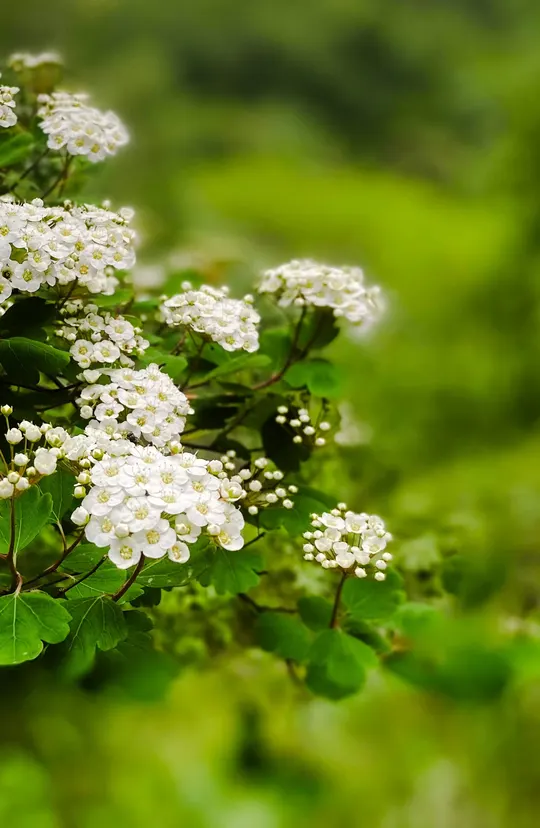 枝头簇拥着簇簇白花,小巧玲珑,花瓣如雪般纯净,花蕊似星子闪烁。绿叶如翠玉相衬,清新又娇俏。它们静静绽放,似在诉说着春日里的温柔密语,于一隅天地间,自成一方纯净美好的小世界。