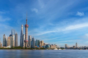湛蓝天空下,上海外滩的摩天大楼林立。东方明珠塔尤为醒目,与众多现代建筑共同勾勒出壮丽的城市轮廓。黄浦江碧波荡漾,映衬着璀璨的都市盛景,展现出上海作为国际化大都市的独特魅力与蓬勃活力。
