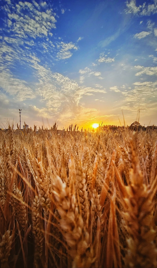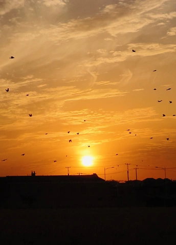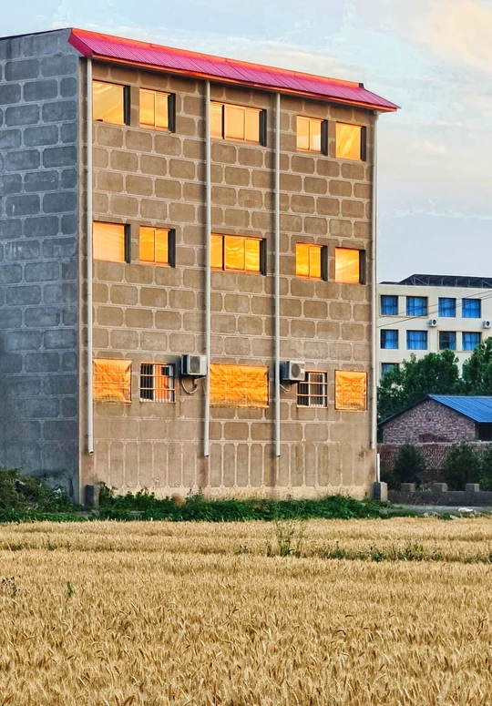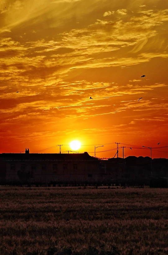 夕阳下金色的麦田, 记忆中的鸟儿还在肆意飞翔, 再不见奔跑的少年和回不去的童年。 米拍ai评测 * **色彩:** 大胆热烈的色彩运用确实抓人眼球,橘红色的主色调营造了温暖、充满活力的氛围。不过,色彩饱和度略高,导致画面有些刺眼,少了一份柔和与细腻。 * **光影:** 太阳的光芒强烈而耀眼,为画面带来了生机。建筑和地面的剪影效果增强了画面的层次感。但是,细节的缺失也让画面显得有些单调。 * **构图:** 画面采用了三分法,天空占据了大部分空间,突出了夕阳的美丽。飞鸟的加入打破了画面的沉闷感。但是,地面的比例稍显不足,导致画面重心偏上。 * **后期处理:** 后期处理似乎加强了色彩的饱和度,虽然增强了视觉冲击力,但也损失了一些细节。 * **主题原创性:** 夕阳的题材虽然常见,但这张照片通过强烈的色彩和剪影效果,表达了对自然的热爱和对美好生活的向往,具有一定的独特性。 * **情感共鸣:** 鲜艳的色彩能够唤起人们对夕阳的温暖记忆,引发人们对美好时光的向往。飞鸟的加入则增添了一份自由和灵动。