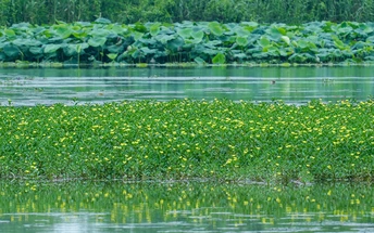 夏日西溪,睡莲悄然盛放,金黄与翠绿交织,倒映在如镜的水面上。荷叶层层铺展,黄花点缀其间,静谧中透着生机,仿佛一幅天然水墨,将湿地的柔美与夏日的诗意娓娓道来。