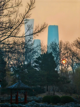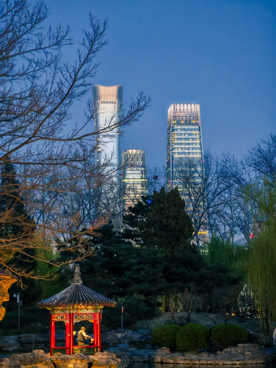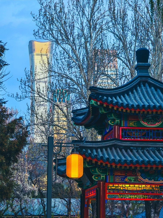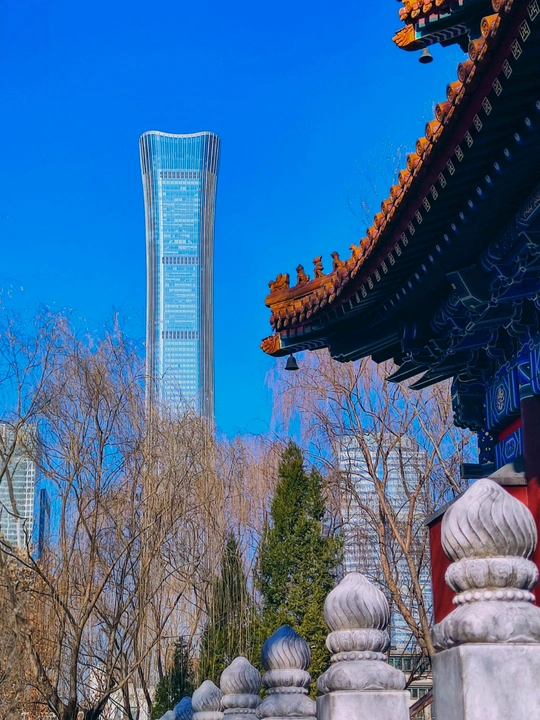 中国尊与传统建筑对望,在蓝天、暮色、繁花间,续写京城浪漫篇章 。