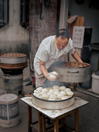 街头蒸笼腾白雾,师傅专注分包子,3元美味,藏着平凡日子的暖。