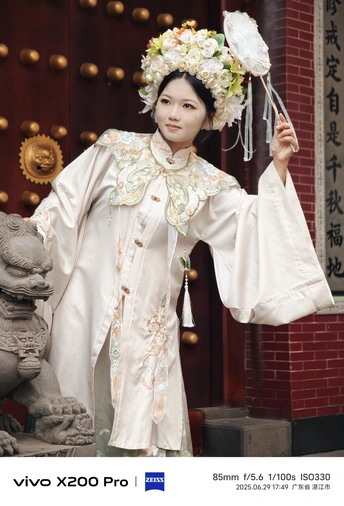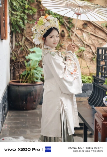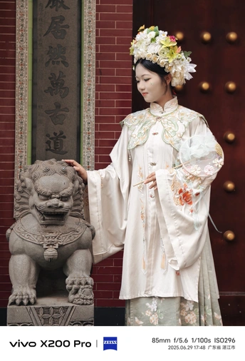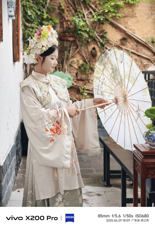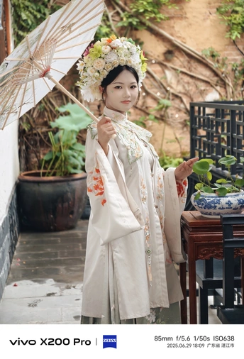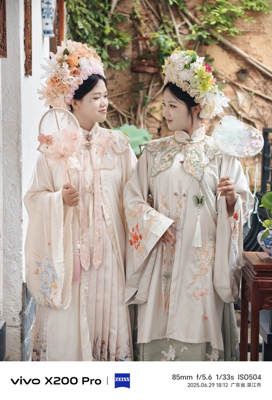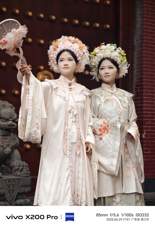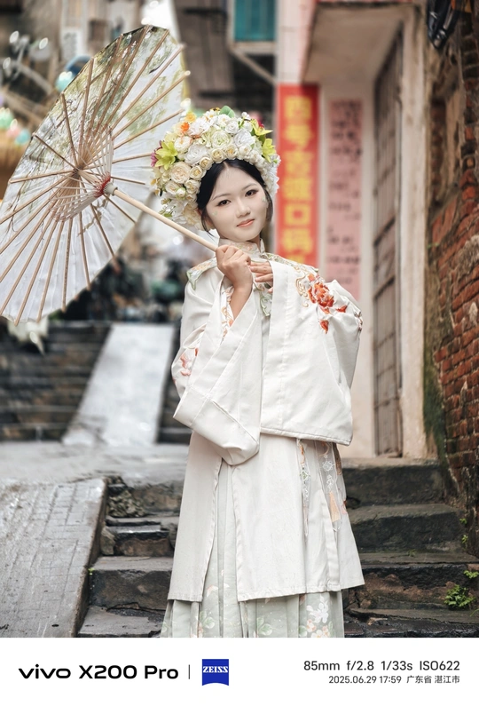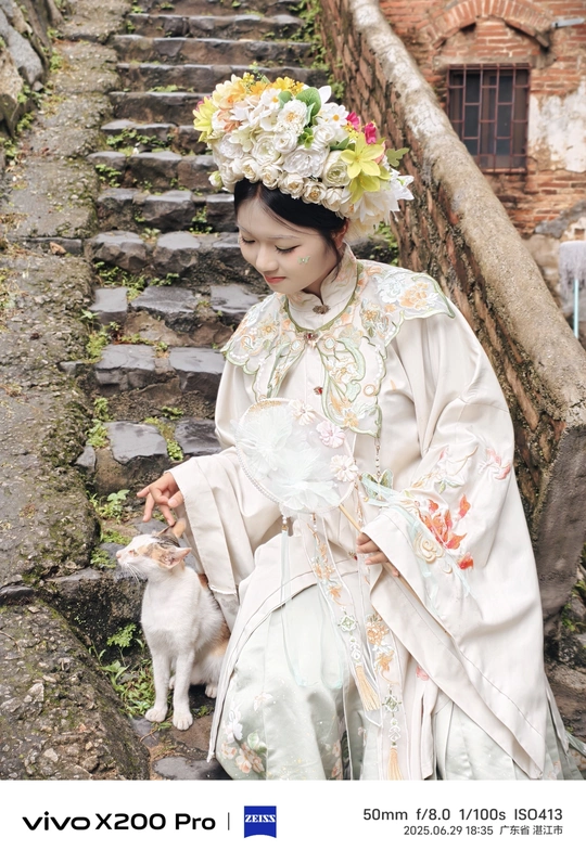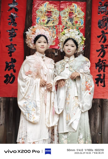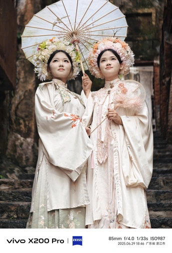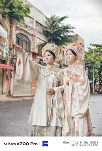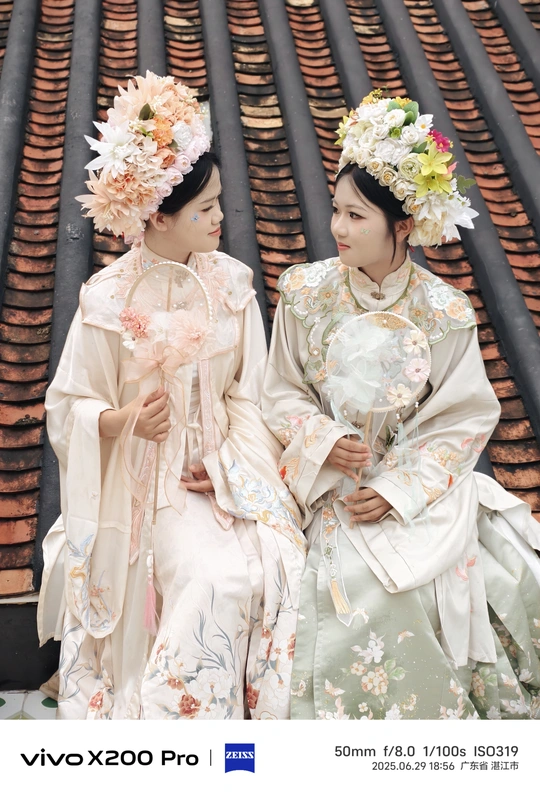 Shot on vivo X200 Pro. 盛夏,一个下过雨的傍晚,两名妙龄少女头戴簪花、身披轻纱,缓步穿行于赤坎老街,静静感受着夏日小巷周边古色古香的独特气氛。她们时而手牵手一起漫步在石阶上欣赏四周的风景,时而一起端坐于瓦房前有说有笑,神情惬意......