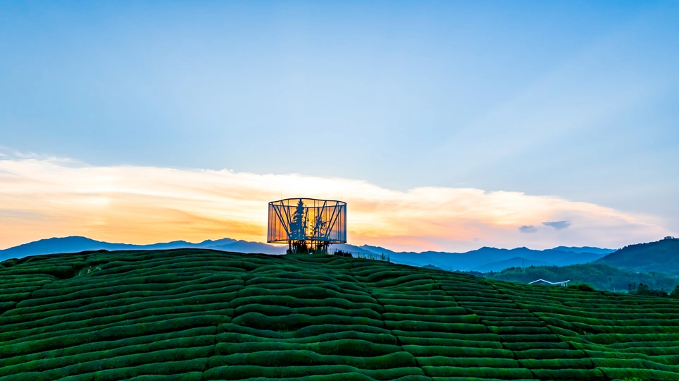 暮色漫染茶田 远处那一方金属构架,框起树影与霞光。 远山如黛,层云似缎, 每一片茶叶都在晚风里, 轻吟着田园的静美与温柔, 把时光晕染成诗, 沉醉了天地,也沉醉了我。