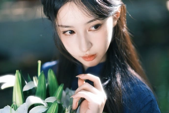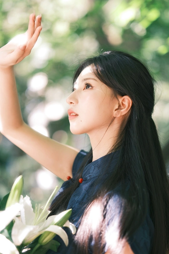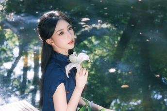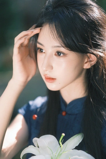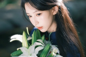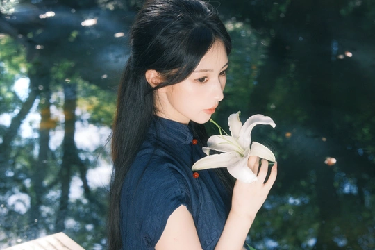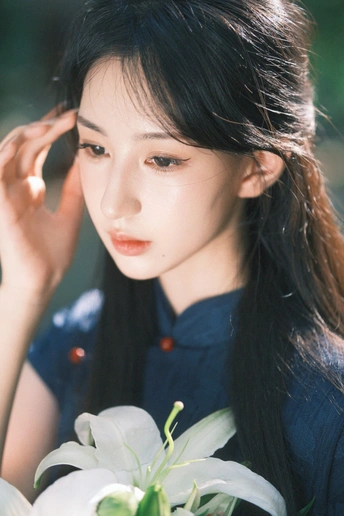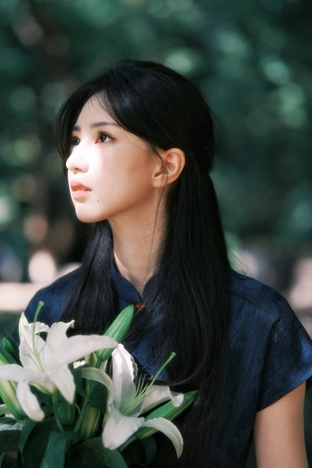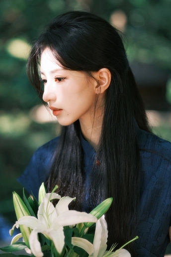 蓝裳半掩清颜瘦,百合盈怀岁月幽。