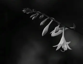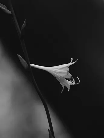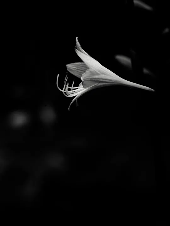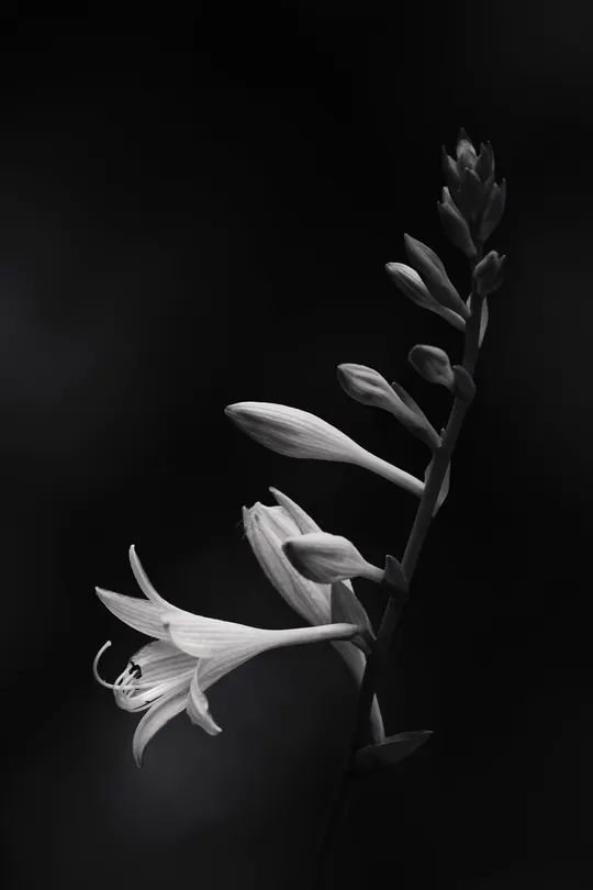 深沉如夜的背景,托出玉簪花的素洁剪影。花瓣似被月光轻吻过的薄纱,纹理是岁月悄然走过的痕迹,花蕊如细语,在寂静里轻吟。它们以黑白为语,摒弃浮华,将生命的本真与清寂,凝练成这一瞬的孤美,任观者在暗与明的交织里,聆听花魂的浅唱 。