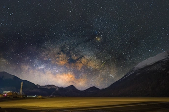 银河之心升起在冬季的然乌湖畔,星点划过,照亮雪域高原