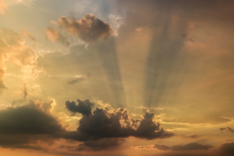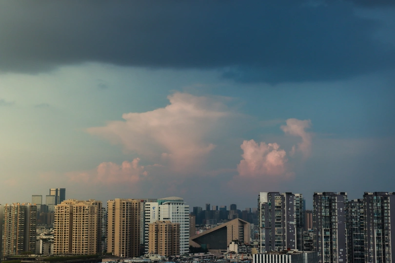 近期的雨水将空气清洗干净,天空露出本色,日落前一小时,云层随着光线的变化呈现出彩色