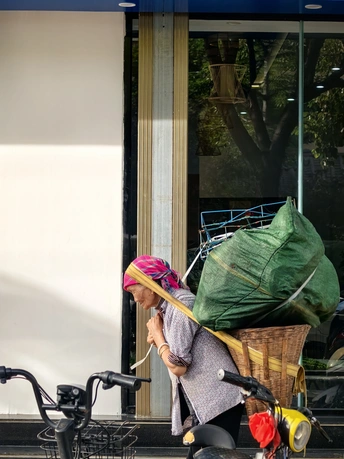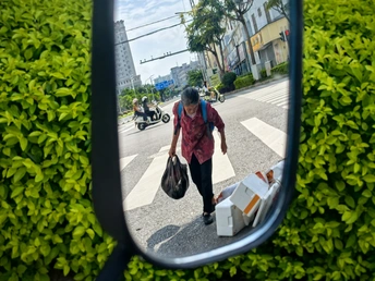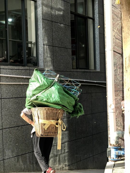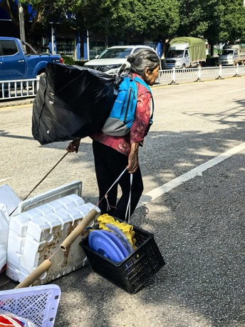 在城市的车水马龙间,有这样一群沉默的拾光者。四张照片,聚焦于拾荒老人的身影,拼凑出他们与城市共生的日常片段。 街头转角处,老人头戴花头巾,背负硕大竹篓,篓中绿袋鼓起,沉重压弯脊背,却压不垮她前行的韧性,城市建筑的现代线条作陪,新旧碰撞出生活的真实;交通镜里,老人提袋缓行,周围是疾驰的车、林立的楼,镜面折射出她与城市秩序微妙的交织,垃圾与行人、繁华与窘迫,在此刻同框;建筑阴影下,竹篓与绿袋再次成为视觉焦点,老人半遮的身形,似在与城市的坚硬外壳默默对抗,每一步都踩出生活的重量;马路边上,老人身背大包,手拖杂物,那些被城市丢弃的“无用”之物,在她这里重寻价值,车辆穿梭的背景,衬出她的渺小与坚韧。 这些画面,是城市褶皱里的生活切片,记录着拾荒者在缝隙中讨生活的模样,也让我们看见城市繁华背后,被忽略的生存韧性,他们以拾荒为业,捡拾着城市的边角料,也拼凑出关于苦难、坚守与平凡的深刻叙事,提醒我们,每一个为生活奋力的身影,都值得被看见 。
