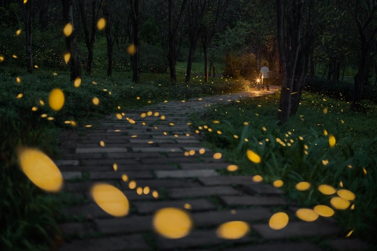 在佛山西樵山景区里的环山花海,天黑前拍好基础画面,然后等待萤火虫出现后连拍。因为这个画面里的地形,我脑海中希望的萤火虫飞行轨迹,是会脑补成从远到近飞到人和灯的位置,同时能隐约地贴合这一人工路径,会很符合画面里富有张力的线条对于视觉的引导作用,但是这些大自然的生灵似乎有它们自己的想法,它们从左侧稍高的山坡上倾斜而下,像过清晨的马路一样,自在地在镜头面前划过,有时又闪着光飞回路径左侧召唤更多伙伴出现,非常活泼。 使用A7M4转接佳能50mm f1.4 NFD(胶卷手动镜头),前期等待到接近9-10点后才能顺利拍摄,建议尽量等到热闹人群散去后再锁下快门线。