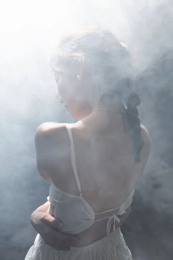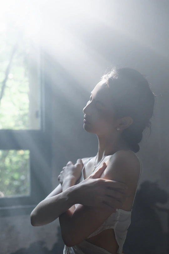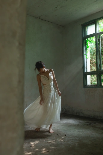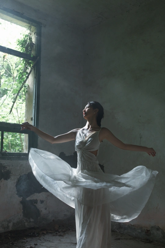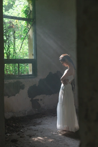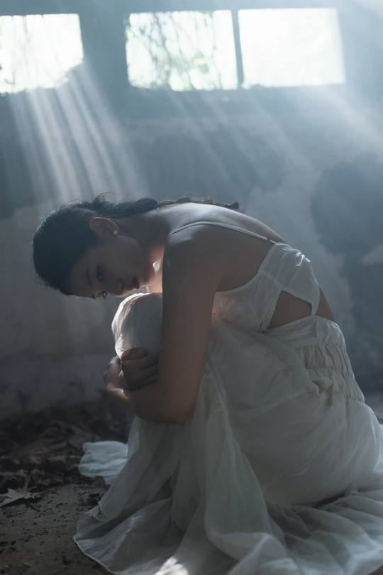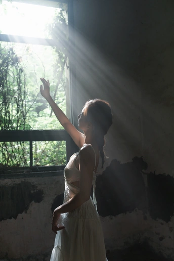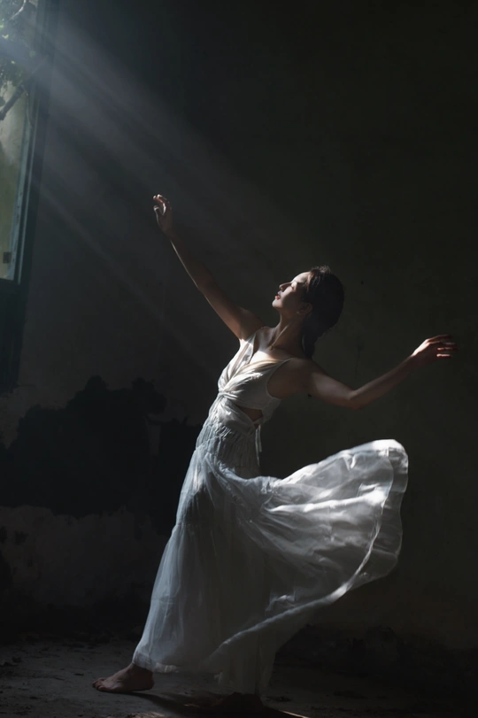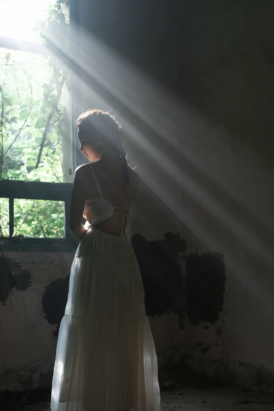 丁达尔效应下,光穿过残垣,在尘埃里铺陈轨迹。她立于明暗交界,白裙随光舞动,似与岁月的缝隙私语,每缕光线都成了故事的注脚,让虚无的光,有了可触碰的温柔形状,诉说着光有迹,心亦有依。