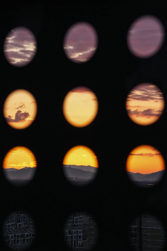 透过排列的窗孔,看夏日朝霞渐次铺展。最初,浅紫天空晕着薄云,像未醒的梦;接着,橙光漫入,给云朵描上金边,是黎明在试探。当炽热铺满孔洞,远山、楼宇都成了剪影,才惊觉,这不是单一的朝霞,是时光借小孔,把破晓的浪漫,一格格塞进眼里,每孔都是独属于清晨的、会流动的画 。