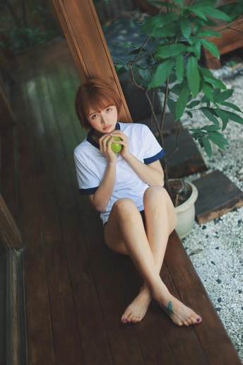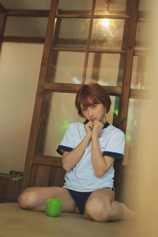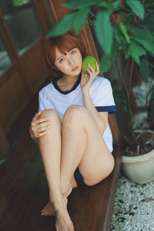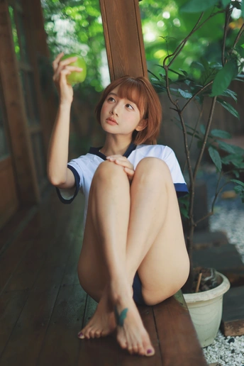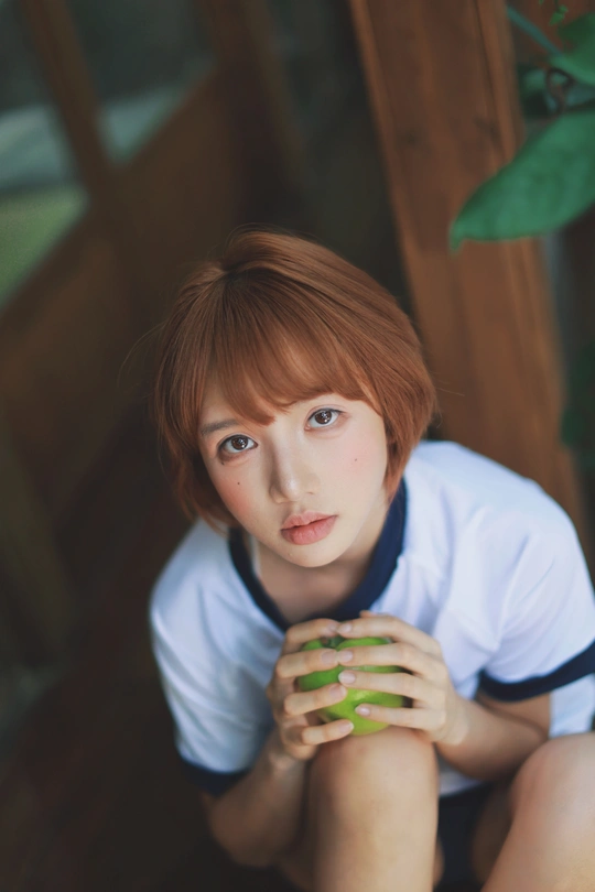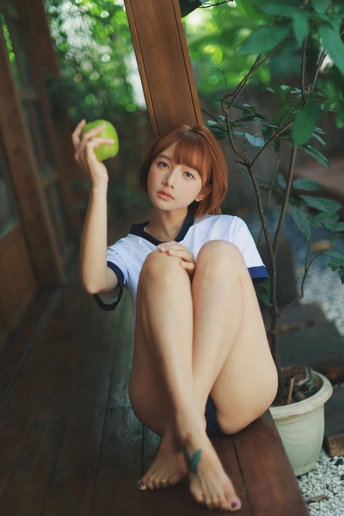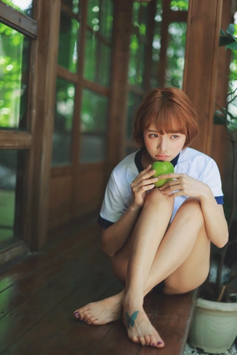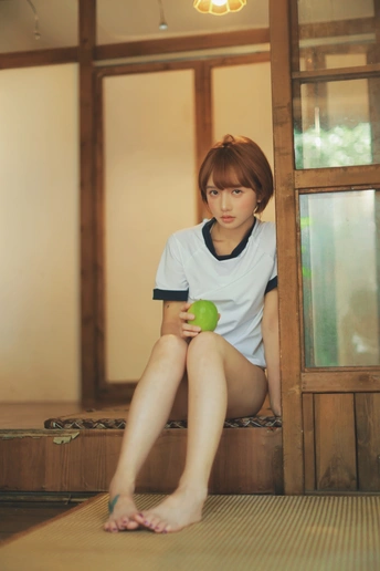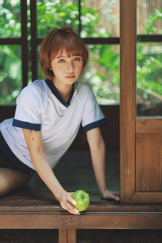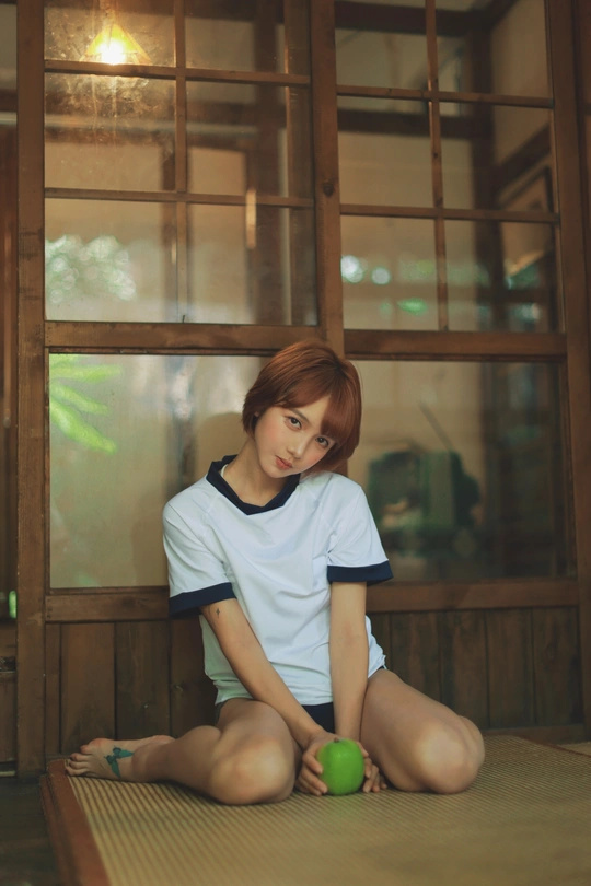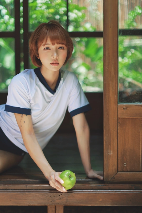 在一间被绿意环抱的木质小屋内,一位短发女子身着简约的运动款上衣,跪趴在地板上。她一只手轻轻搭在木框上,另一只手托着一颗青苹果,眼神澄澈,似带着一丝懵懂与纯真,仿佛是从青春时光里走来的少女,将青涩与美好定格在这一方静谧空间之中。