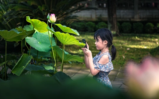 ~~夏日的午后,阳光轻柔地洒在池塘边,满池的荷叶挨挨挤挤,像一个个碧绿的大圆盘。粉嫩的荷花从荷叶间探出头来,有的还是花骨朵儿,饱胀得马上要破裂似的;有的则已悄然绽放,露出嫩黄色的莲蓬。 小姑娘穿着碎花连衣裙,站在池边,小心翼翼地举起手机,想要把这美丽的景象定格。她的眼神专注而温柔,仿佛在与荷花轻声对话。或许在她心里,荷花是夏日里最美的精灵,每一片荷叶、每一朵荷花,都藏着一个关于夏天的梦。 这一幕,是对荷花之美的欣赏,更是孩子内心那份纯真与美好的自然流露。