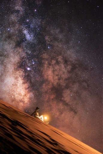 广袤沙原之上,夜幕如墨,银河横空出世,星云似梦幻轻纱。一人独坐沙丘,手捧暖黄微光,在沙海孤寂与星海浩瀚间,聆听宇宙无声絮语,任思绪随星芒飘向无尽远方 。