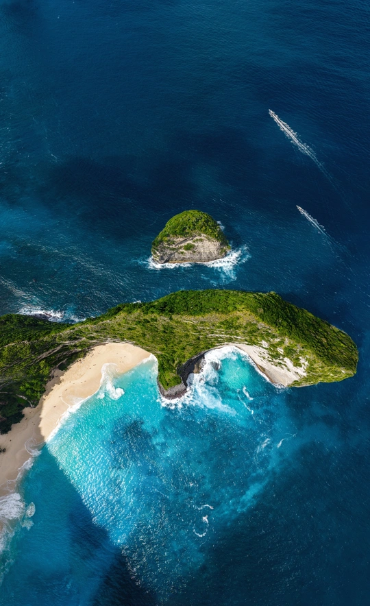 「大疆御4Pro定格佩尼达岛的天空之眼—— 当湛蓝揉碎在薄荷色的浪尖, 翡翠般的坠崖正与海天共织锦缎。 千层白浪吻过银沙,两叶快艇划过绸缪碧波, 自然的笔触在此处悬停, 连呼吸都染上了热带的光影韵律。」