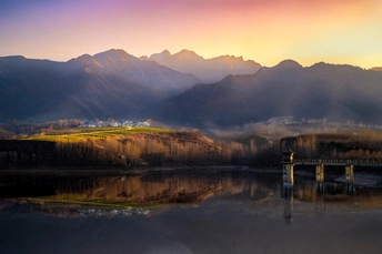 构图:以 水平对称构图 构建画面,水面如镜面复刻山峦、桥亭与村落,上下镜像形成视觉闭环,强化空间纵深感;前景桥亭作为 “视觉锚点”,引导视线向中景村落、远景山峦递进,串联 “近 - 中 - 远” 三级空间 。 光影:捕捉 日出侧逆光 瞬间,暖金光线沿山脊勾勒 “金边”,与暗部山峦形成明暗对比;天空从粉紫到橙黄的 渐变色阶 呼应晨昏过渡,水面倒影同步承接光影层次,让冷暖色调在镜中交融 。 意境:晨雾轻笼时,山乡静卧镜影间,建筑、田园与群峰借倒影完成 “天地对话”,定格自然与人文共生的谧境,诠释 “静美晨晖里,山水共一帘” 的东方韵味 。